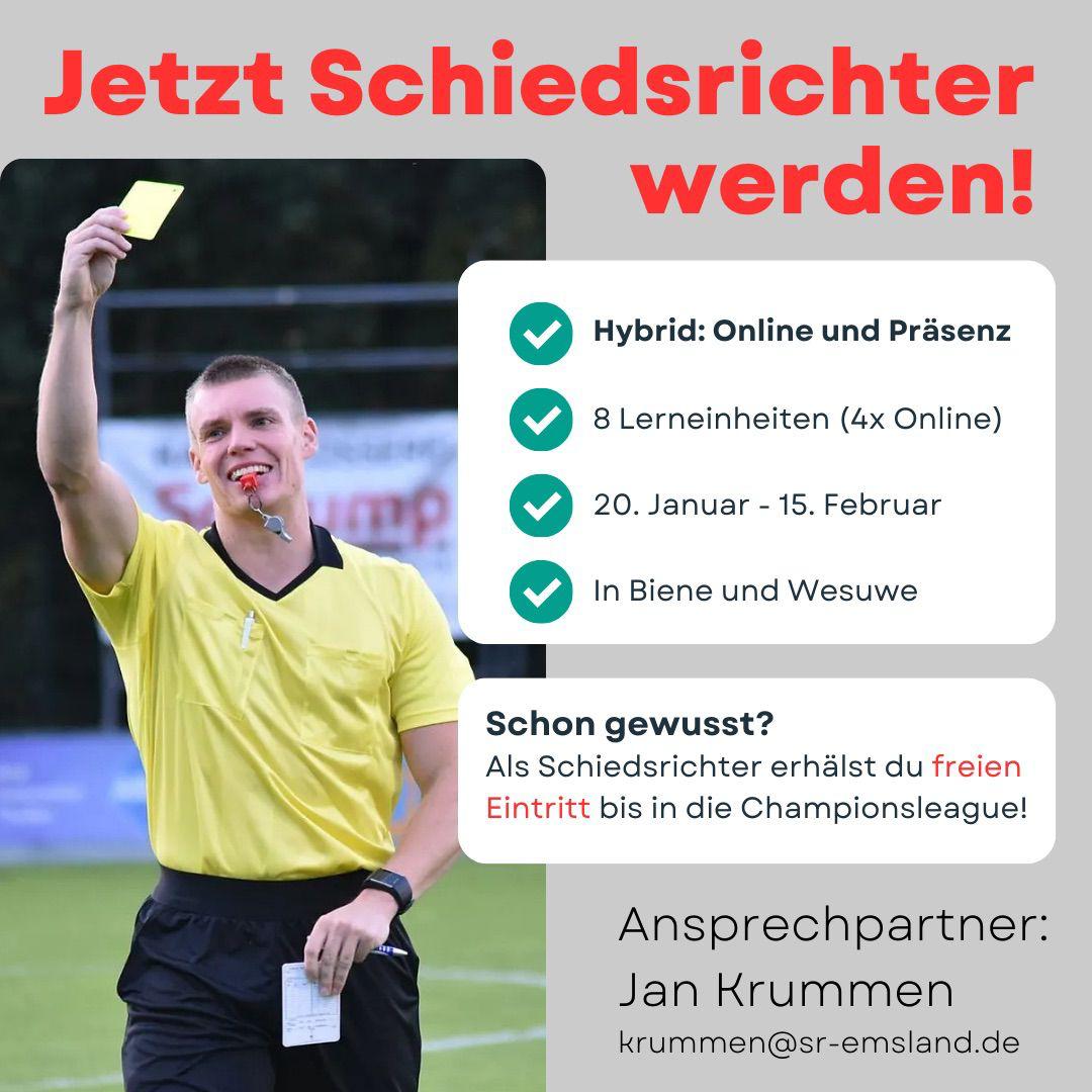 3. Januar 2026Einen „Hybrid-Schiedsrichterlehrgang“ führt der Schiedsrichterausschuß des NFV Kreis Emsland durch. In der Zeit vom 20.01.2026 bis 15.02.2026 können die Anwärter im Onlinverfahren und innerhalb mehrerer Präsensveranstaltungen die Qualifizierung zum Schiedsrichter erlangen. Das Mindestalter beträgt 14 Jahre. Interesierte können sich beim Vorstand des FC Wesuwe oder direkt beim Ansprechpartner Jan Krummen unter krummen@sr-emsland.de melden. […]